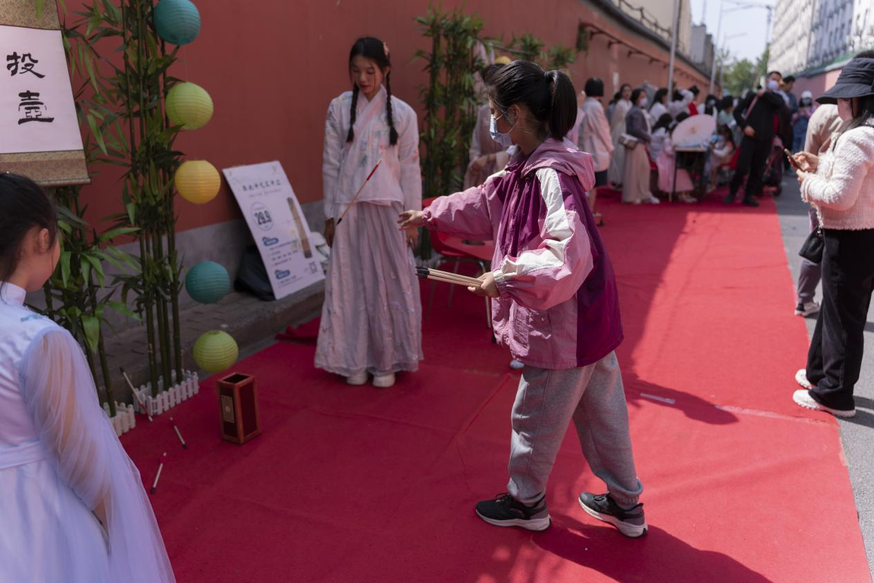 浓厚的现场氛围吸引了大批过往居民根据前期安排同学们纷纷各就各位,在各自负责区域开展志愿服务本次游园会项目包含汉服走秀古筝弹奏、商王鼓演奏、手绘油纸伞、缝制香囊、趣味投壶在才艺表演区大家负责维持现场秩序表演道具摆放递话筒等在趣味活动区大家负责活动引导活动规则解读等