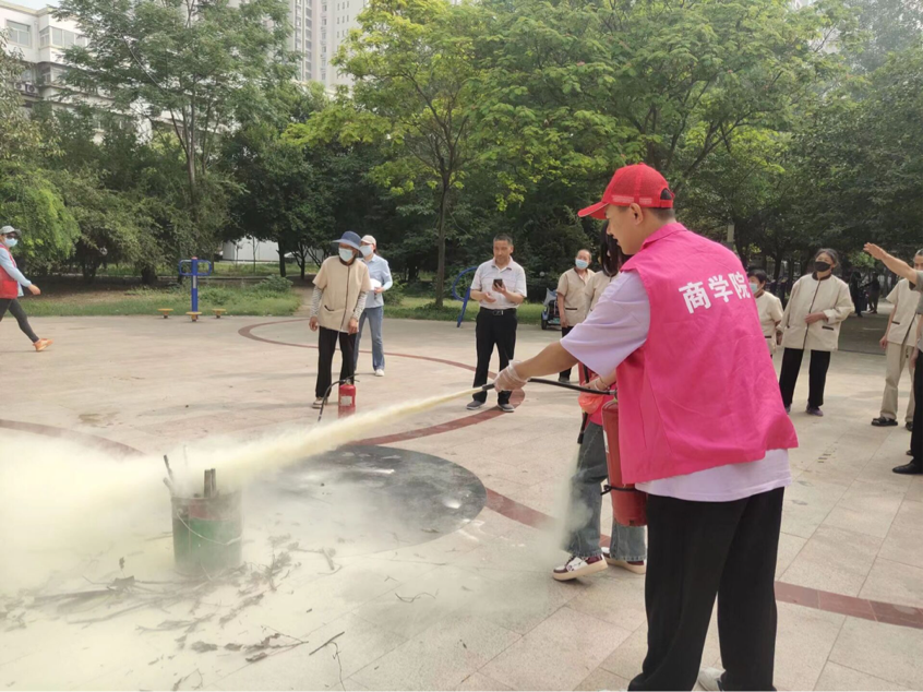 大扫除活动过后,志愿服务队参加了社区的消防演练活动,通过学习和亲身实践,志愿者们加强了对于消防安全的认识同时也熟悉了消防器材的使用,随后协助社区工作人员向居民们演示讲解灭火器的正确使用方法,帮助社区居民增强消防安全意识。