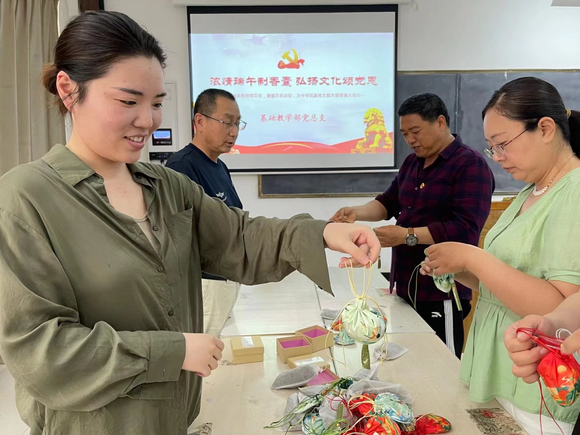 端午前夕,基础教学部党总支为了向抗美援朝的老英雄们送去节日慰问,组织师生共同开展手工制作香囊活动。在大家巧手制作下,凝聚着师生祝福的香囊和一封慰问信一并被邮寄到郑州抗美援朝老战士之家。