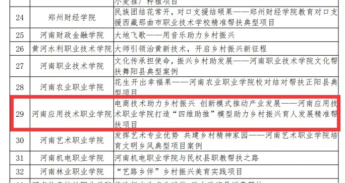 近日,河南省教育厅公布了河南省高等学校精准帮扶典型项目的入选名单,商学院的《电商技术助力乡村振兴、创新模式推动产业发展——河南应用技术职业学院打造“四维助推”模型助力乡村振兴育人发展精准帮扶项目》脱颖而出成功入选。