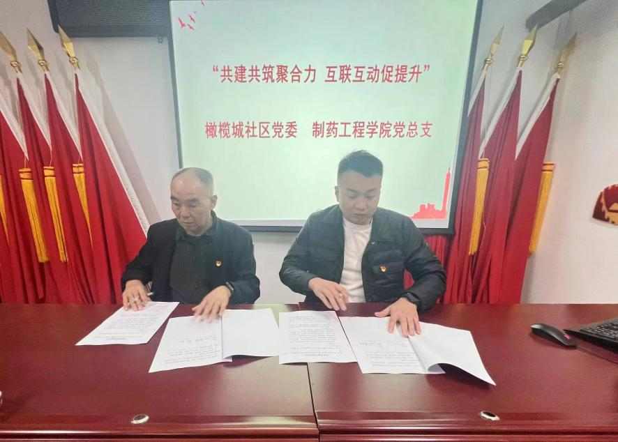为进一步增强基层党建整体效应,实现基层党组织资源整合、优势互补、共建共享,橄榄城社区党委书记曹海涛和制药工程学院党总支书记窦传斌分别代表橄榄城社区党委和制药工程学院党总支进行《党建联建共建协议书》签约。