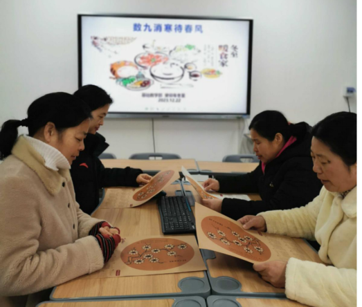 上午,基础教学部主任黄绿欣带领老师们一起绘制“九九消寒图”,并交流冬至的节日习俗。“九九消寒”源自中国古人“数九过冬”的民间习俗。自冬至开始,古人以每九天为一九,直至“九九”,染梅数九是对一枝有八十一片花瓣的素梅的逐次涂染,“日染一瓣,瓣尽而九九出”。以染梅“数九”方法排遣因天寒地冻带来的情绪压力,并且用温暖且浪漫的方式等待九九八十一天后春天的到来。
