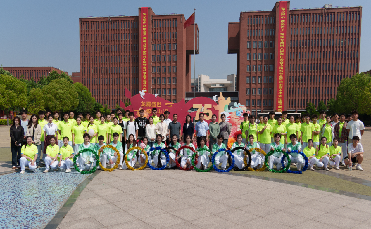 开幕式上,本科部66名学生组成的方队通过创意花车表演的形式呈现了一场精彩纷呈的视觉盛宴,赢得了现场观众的热烈欢呼和阵阵掌声。这次表演主题为“龙腾盛世迎华诞 锦绣山河谱新篇”,随着花车上四位学生代表演唱的《上春山》歌曲律动,方队中每一位同学身着翠绿色的服装,动作整齐划一,步伐铿锵有力,他们仿佛春天的使者,用优美的舞姿展现了春天的生机与活力。最后以奥运五环造型结尾,惊艳全场。在中华人民共和国成立75周年来临之际,大家用挺拔的身姿、崭新的风貌、响亮的口号、精彩的表演不仅彰显着学子们的青春活力,表达了对祖国繁荣昌盛的美好祝愿,新时代青年将以更加昂扬的姿态,迎接挑战,再创辉煌。