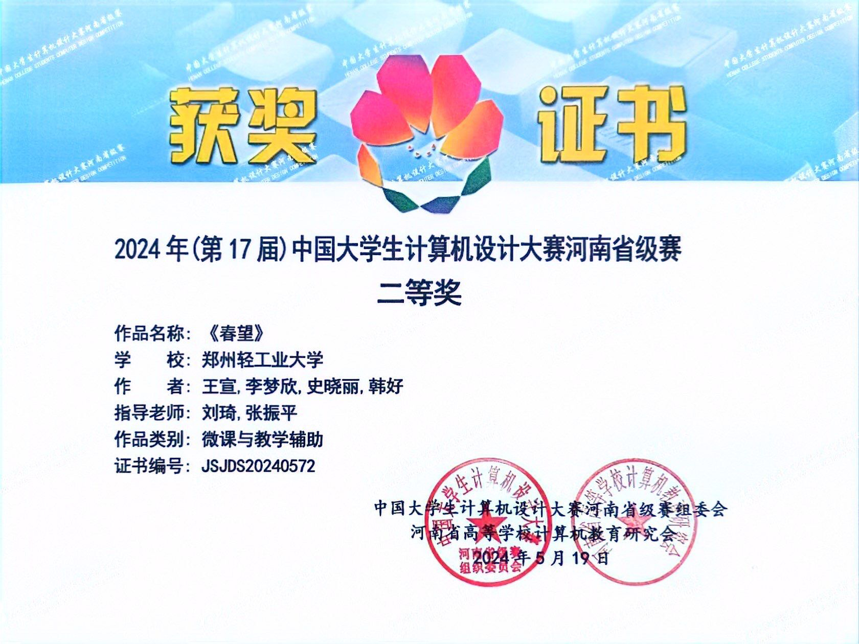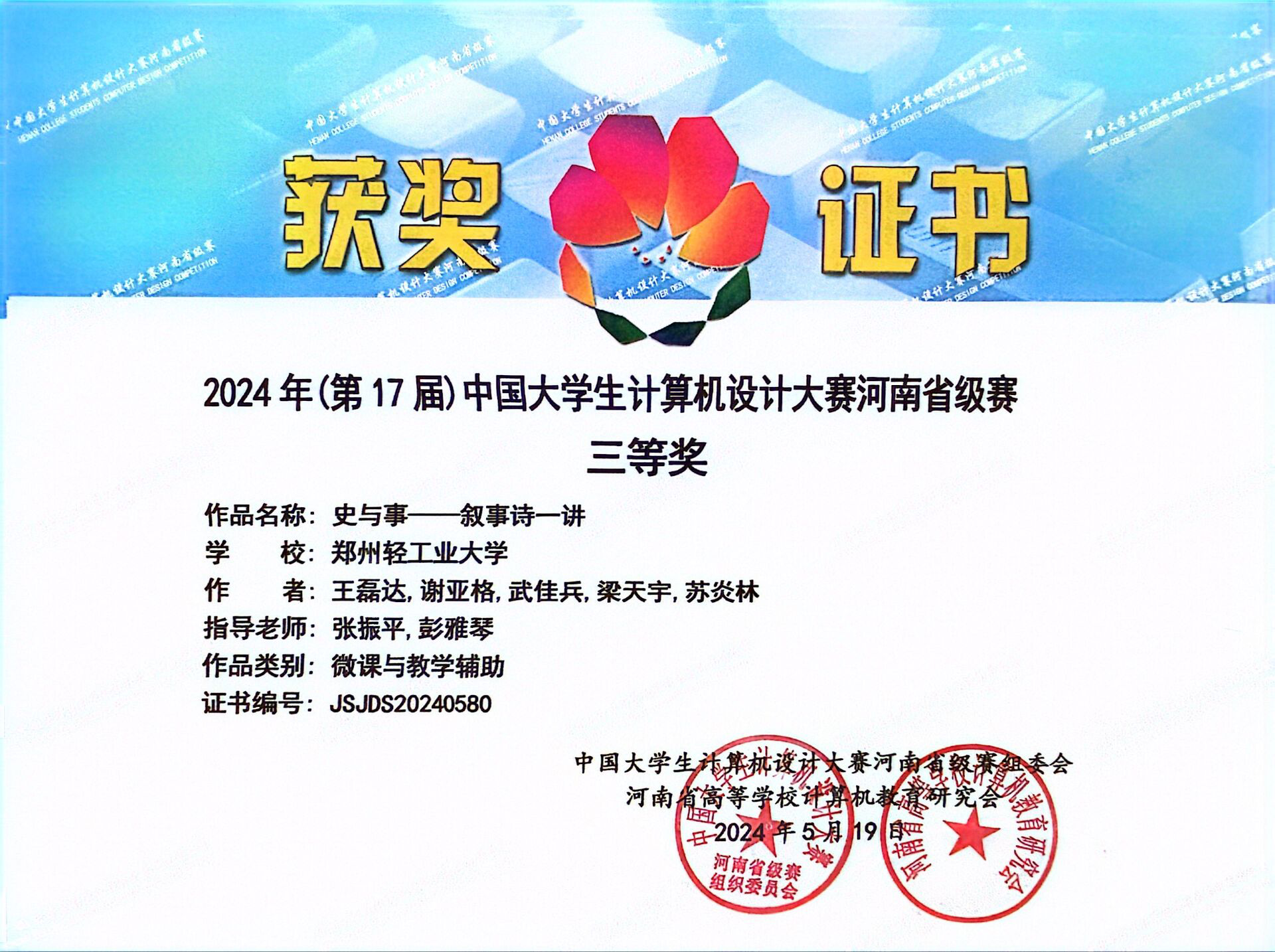本届大赛自今年3月份启动后吸引了全国500余所高校、共计22512件作品参赛。经筛选,本次河南省级赛共有833件作品晋级,本科部共有六件作品入围省赛,参赛项目涵盖数媒动漫与短片类、微课与教学辅助类、音乐制作类三个领域。王宣、李梦欣、史晓丽、韩好团队提交的《春望》作品荣获省级二等奖;王磊达、谢亚格、武佳兵、梁天宇、苏炎林团队提交的《史与事——叙事诗一讲》作品荣获省级三等奖。