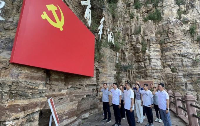 下午同志们沿着习近平总书记的考察足迹,前往红旗渠总干渠上的咽喉工程——青年洞。峡谷深邃,悬崖陡峭;人工天河,令人惊叹。党员教师们徒步行进,穿梭于山林绝壁间,实地探寻红旗渠精神。在建设最艰辛、最费力、最幽深,也最能体现红旗渠精神的青年洞前,默记李先念、郭沫若、江泽民和习近平总书记的题词与谆谆教导。在红旗渠青年洞前,直属党支部书记杜建强带领全体党员重温入党誓词,面向党旗庄严宣誓,抒发对党的忠诚,践行党的宗旨,重温了为共产主义事业奋斗终身的信念和决心。