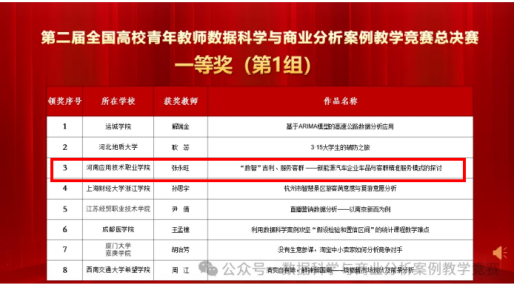 本次大赛自2024年3月1日启动以来,全国共有160名青年教师晋级,最终54名教师到北京参加总决赛。决赛分为采用现场会评分组PK、现场说课、模拟讲课及答辩等环节。张老师的决赛作品选题新颖、应用型强,是基于《业财税大数据分析》课程专创融合系统建设和案例的应用,对企业场景进行问题调研、数据收集、数据清洗、数据分析,进一步推动数据科学与商业分析领域教学模式的创新。作品评析及现场环节得到评委专家一致认可,最终以高职组总分第三名的好成绩荣获总决赛一等奖。