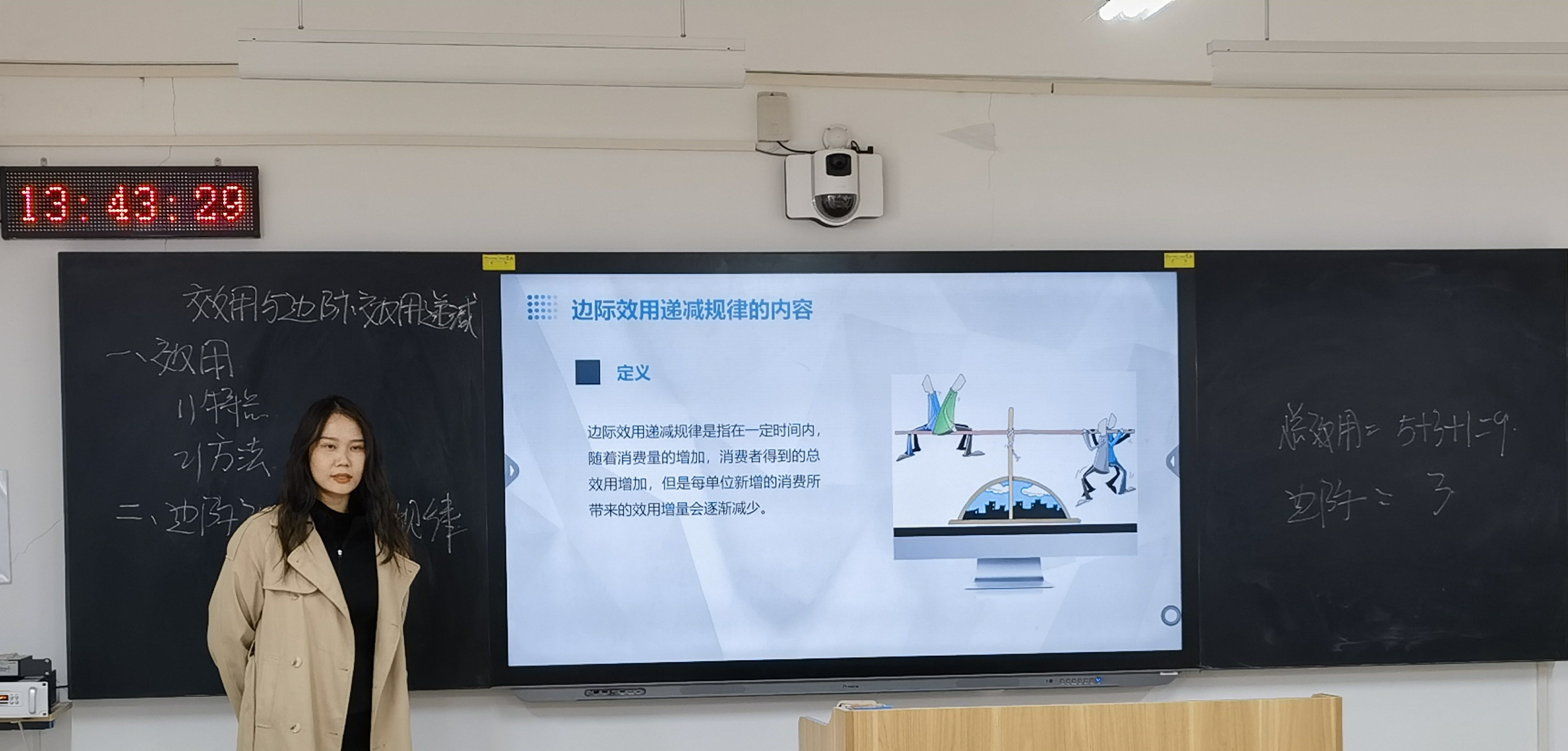 马晓月老师选择《经济学》课程中的《效用与边际效用递减》这一模块进行教学展示。在这一模块中,她详细阐述了效用理论的基本概念,并结合实际经济现象,深入剖析了边际效用递减规律在日常生活中的应用。马老师通过提问、讨论等互动方式,激发学生的学习兴趣,使课堂氛围异常活跃。