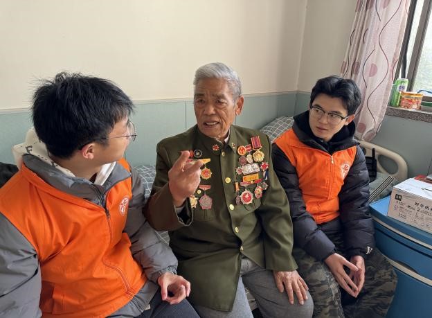 老战士们热情接待了前来探望的师生。他们家中摆放的各种荣誉奖牌和奖章,见证了他们曾经光辉的军旅生涯和抗美援朝的英勇事迹,也将师生们的思绪带到了那段烽火连天的岁月。