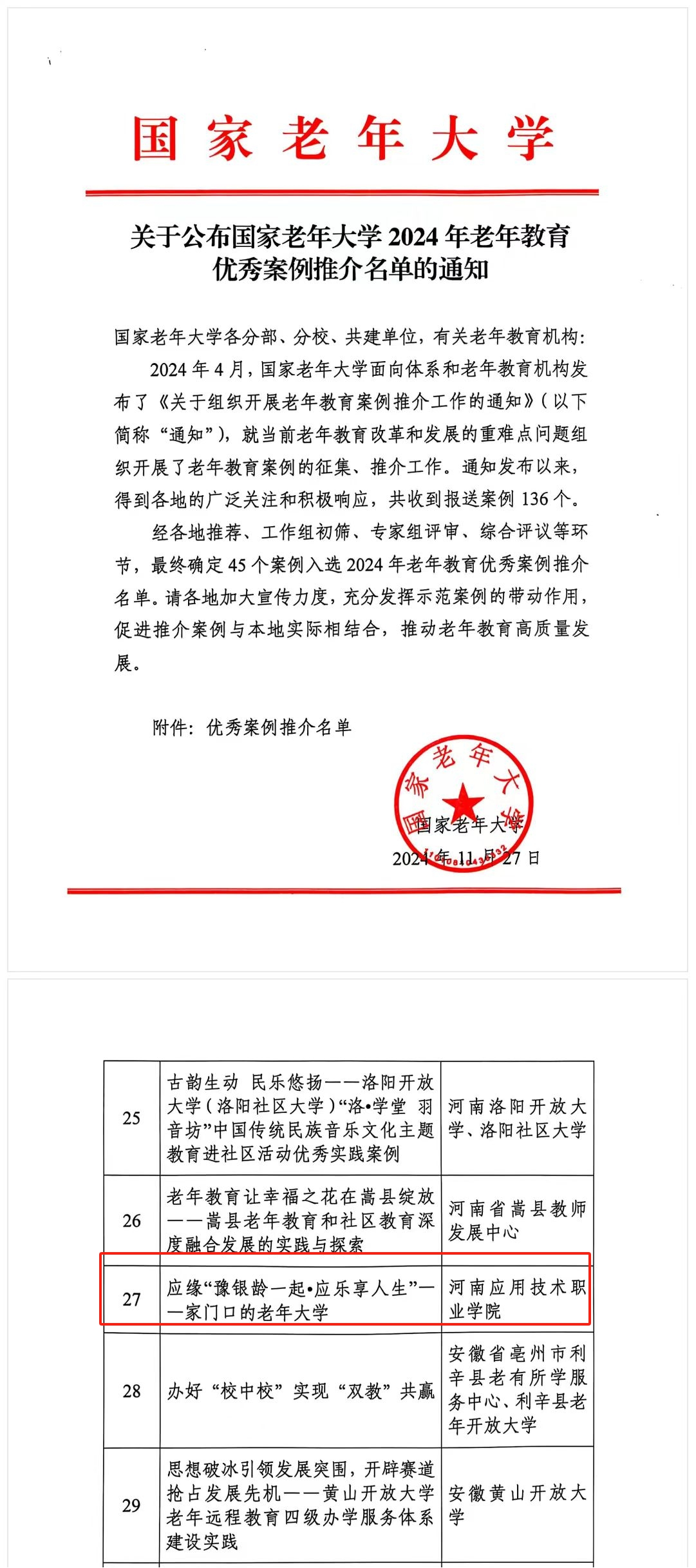 近日,国家老年大学下发《关于公布国家老年大学2024年老年教育优秀案例推介名单的通知》,我校申报的应缘“豫银龄一起•应乐享人生”——家门口的老年大学入选国家老年大学2024年优秀案例推介。