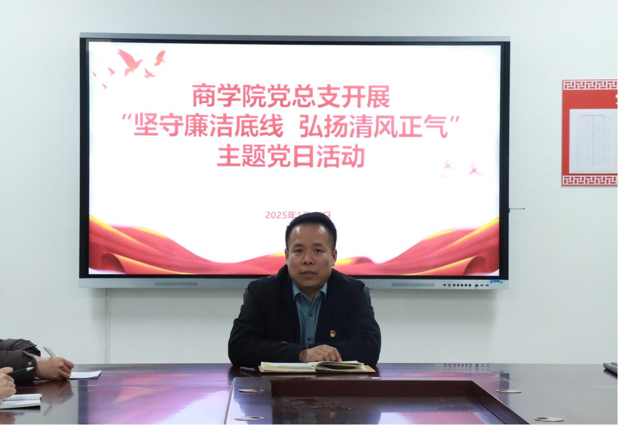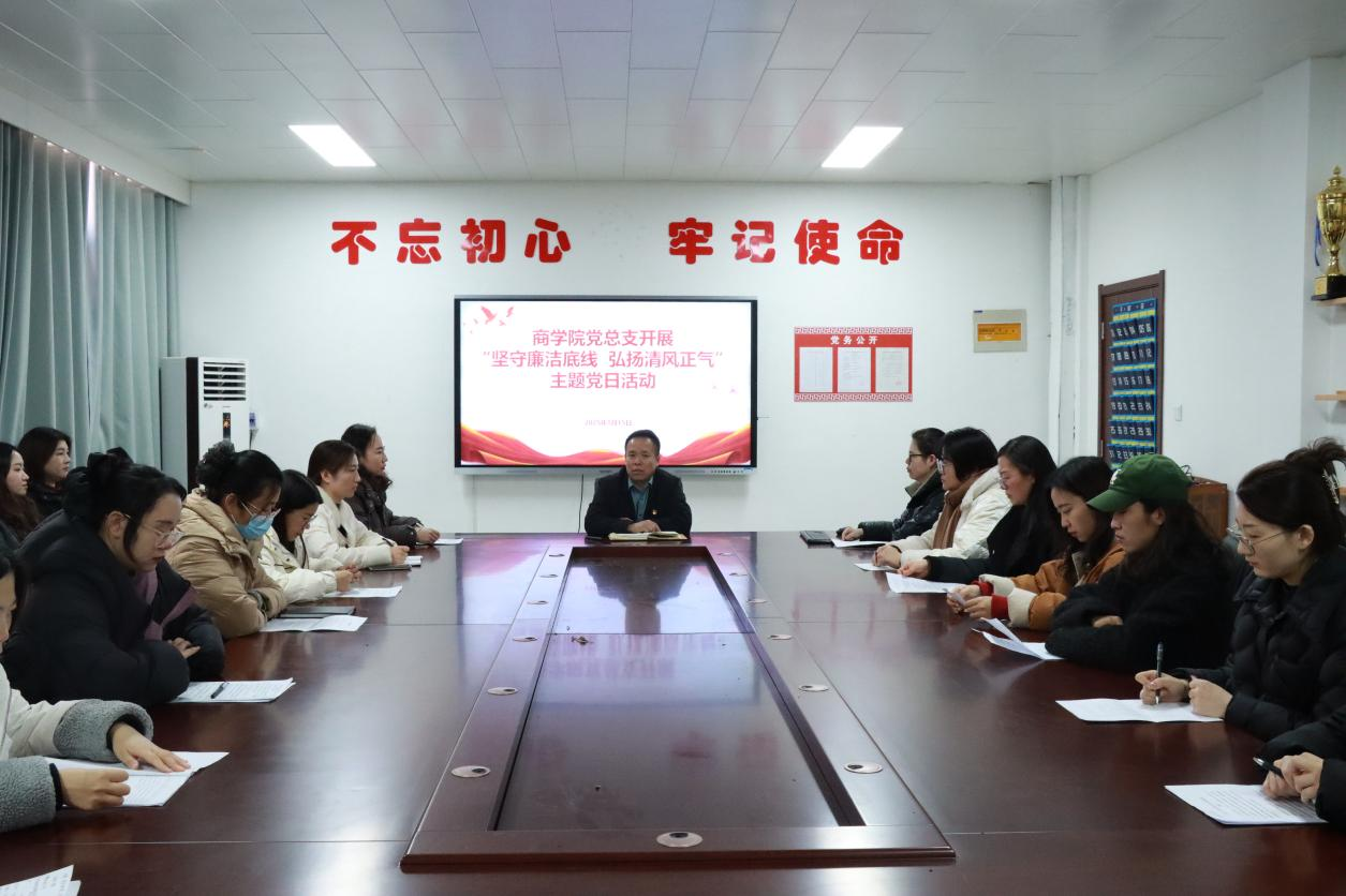 为深入贯彻落实党风廉政建设要求,增强商学院党员教师的廉洁自律意识,筑牢拒腐防变的思想防线,1月15日,商学院党总支开展“坚守廉洁底线 弘扬清风正气”主题党日活动。本次主题党日活动由商学院党总支书记苏云峰主持,全体党员教师参加。