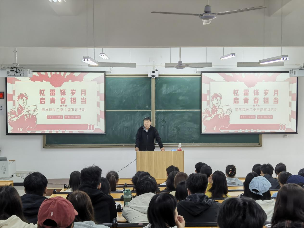 为弘扬雷锋精神,传承红色基因,助力青年学生全面成长。3月25日,商学院组织开展“忆雷锋岁月 启青春担当”雷锋精神宣讲讲座,由学院关工委成员、学校后勤处退休教师王保民主讲。