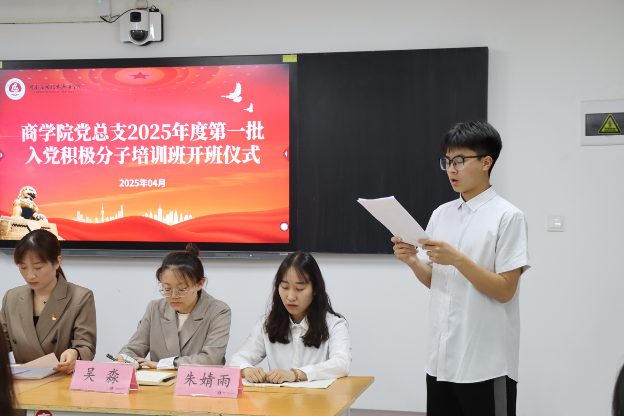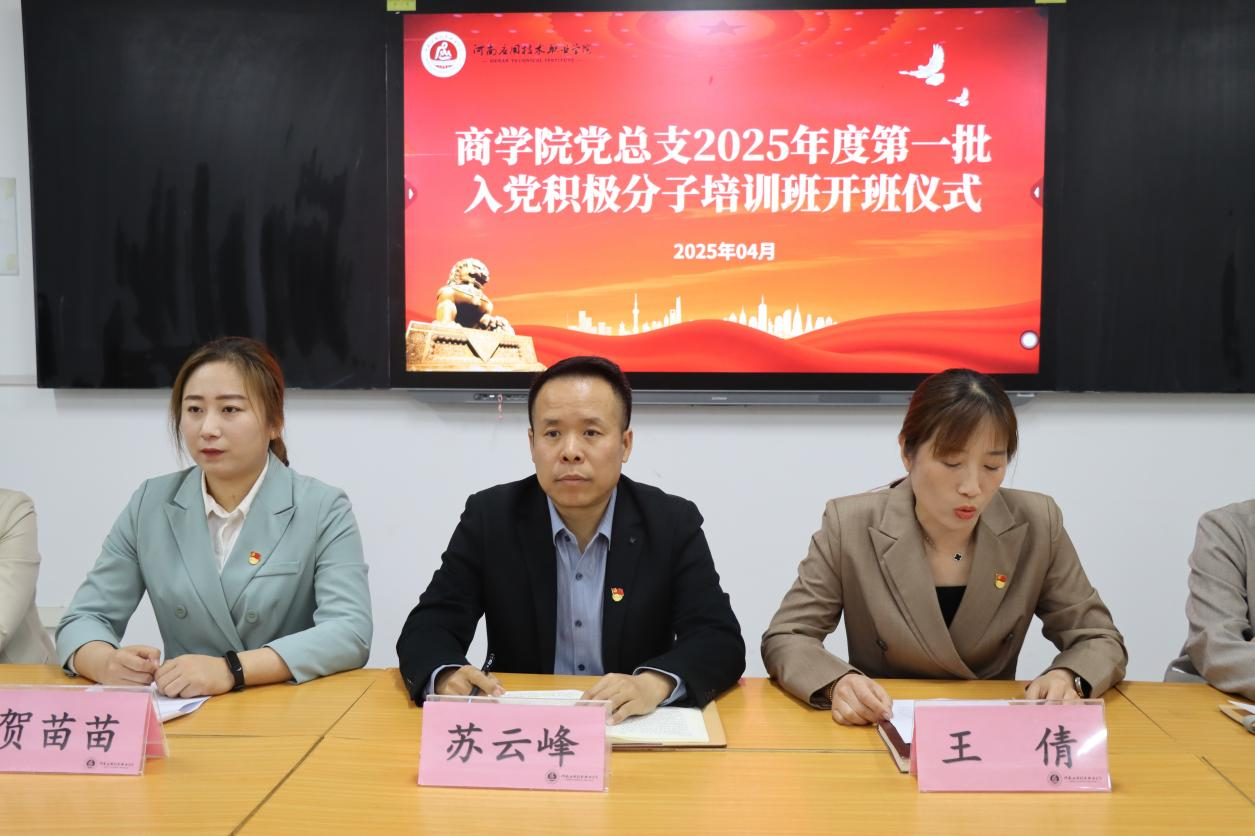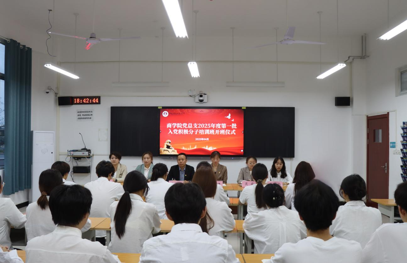 为深入学习贯彻党的二十大和党的二十届三中全会精神,加强入党积极分子的培养教育,提高学员思想政治素质。商学院于4月7日在教学楼E103举行2025年第一批入党积极分子培训班开班仪式。商学院党总支书记苏云峰、学工支部书记王倩及学院相关教师出席本次会议,会议由商学院党总支组织委员贺苗苗主持。