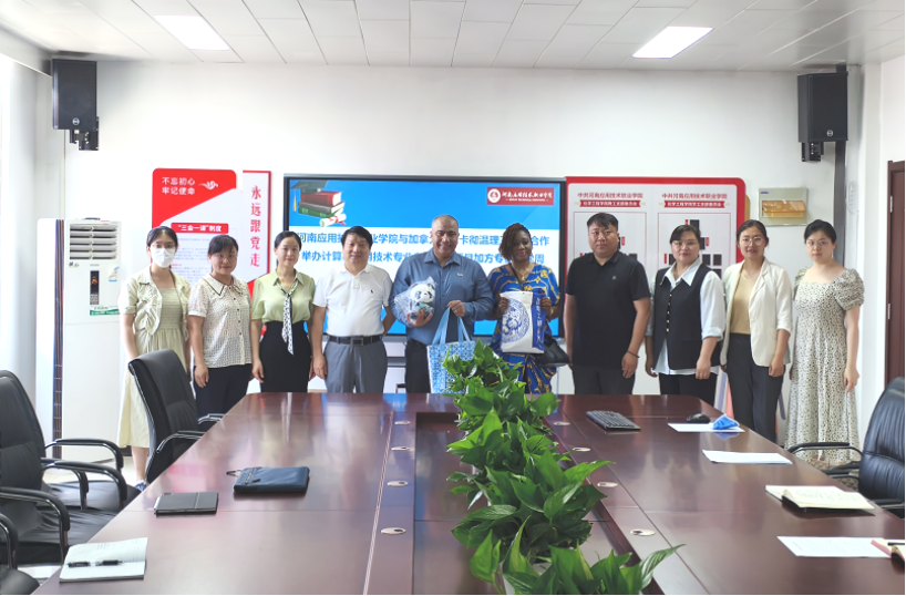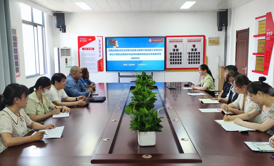 5月19日,河南应用技术职业学院在行政楼512会议室举行与加拿大萨斯卡彻温理工学院合作计算机应用技术专业专科教育项目加方专家教学周启动仪式。本次会议由副院长夏丽珍主持,中加国际合作项目主任、项目管理委员会管理专员Bruce Yu,科研外事处副处长游渊、信息工程学院党总支书记崔琳、学院院长王雷及相关师生参加仪式。