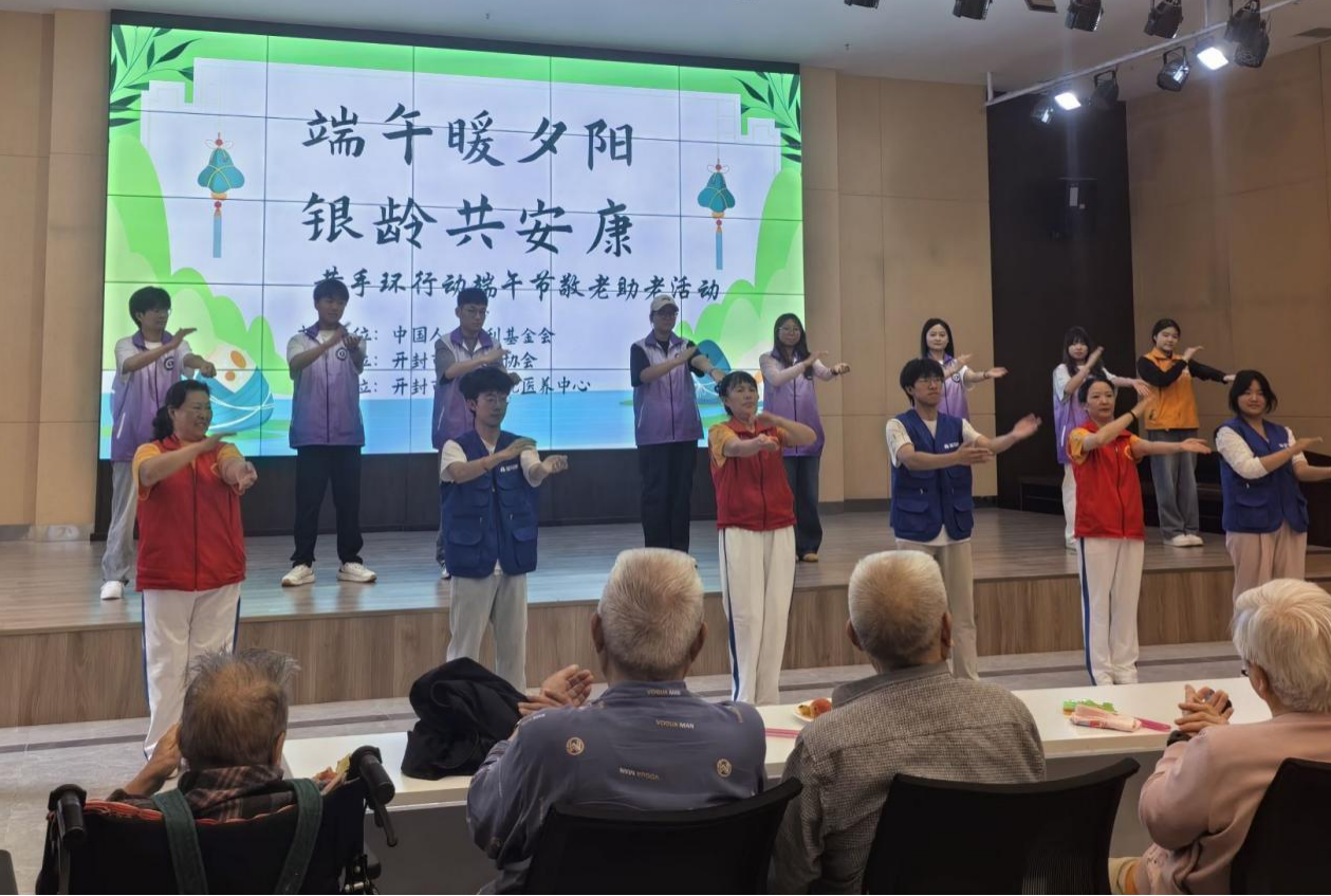 活动现场,志愿者们提前抵达医养中心,以饱满的热情投入场地布置,分工有序,默契配合。待老人入场时,学生们主动上前,搀扶老人缓缓步入会场,并致以端午的诚挚问候。