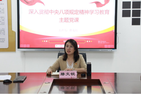 谈话过后,滕文锐向大家开讲深入贯彻中央八项规定精神学习教育主题党课。她先后围绕中央八项规定如何改变中国、为什么开展学习教育、如何践行中央八项规定精神三个问题,分享了自己的心得和感悟,带领同志们进一步领悟了中央八项规定精神所带来的历史成就、开展本次学习教育的重要意义。就后期的学习和实践,滕文锐提出三点要求,希望大家在学习上要远离“形式主义”,树牢政治自觉的“精气神”,在工作中远离“官僚主义”,把稳为民服务的“风向标”,生活中远离“奢靡之风”,戴好遵规守纪的“紧箍咒”。