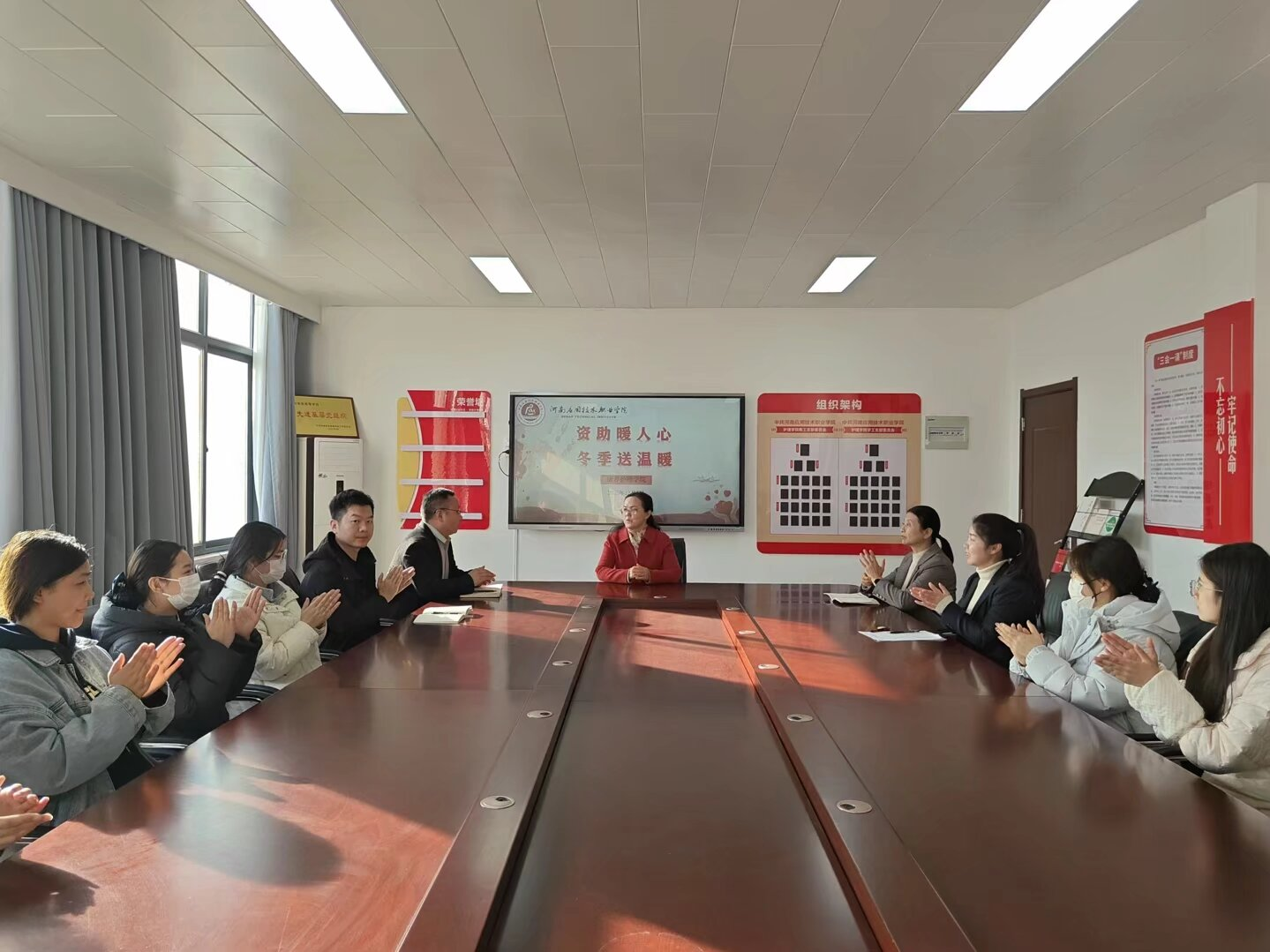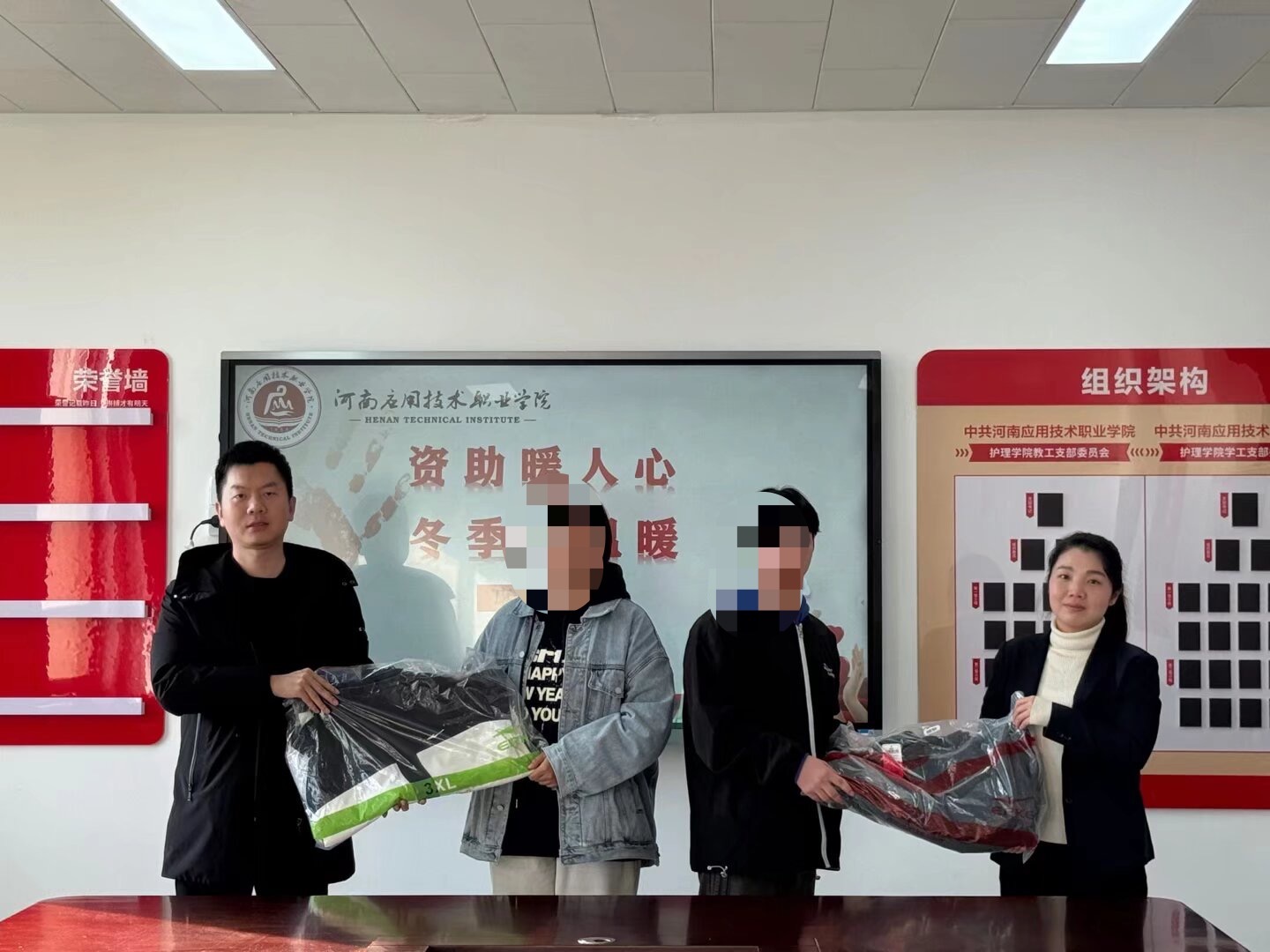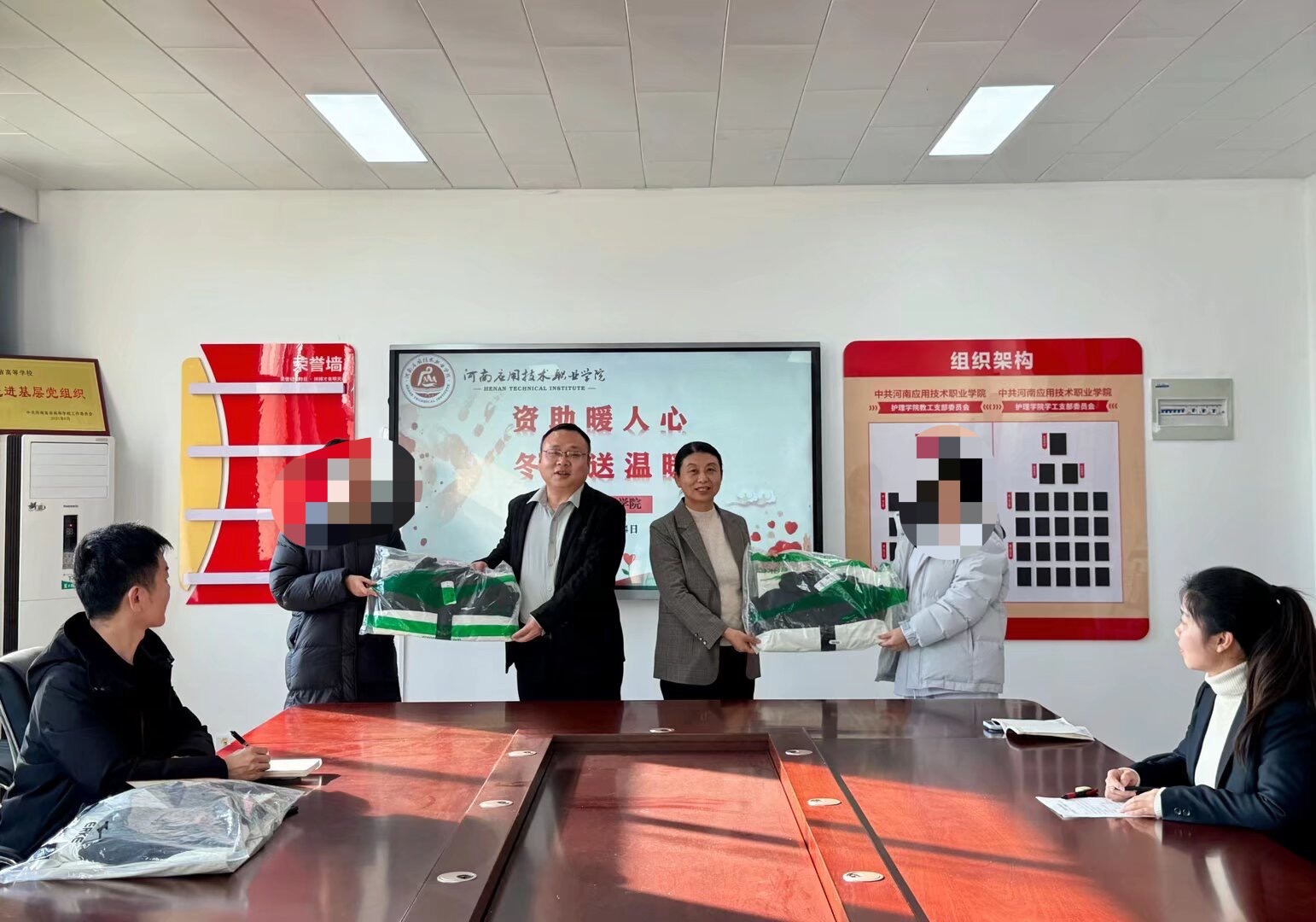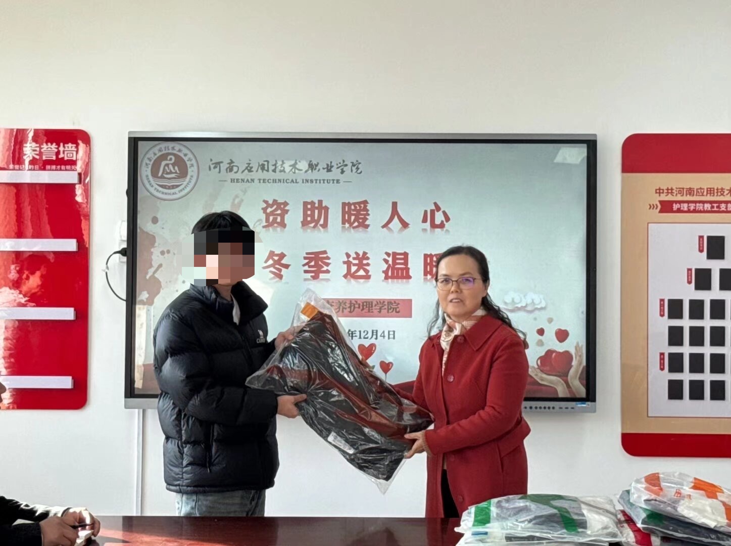 为切实保障家庭经济困难学生温暖过冬,传递学校的深切关怀与殷切期望,12月4日下午,康养护理学院冬季“送温暖”活动在办公楼515温情启幕。校党委副书记、工会主席陈君丽、康养护理学院党总支书记张忠勇、院长王风云及学院部分师生代表共同参与,将冬日里的暖心关怀送到受助学生手中。