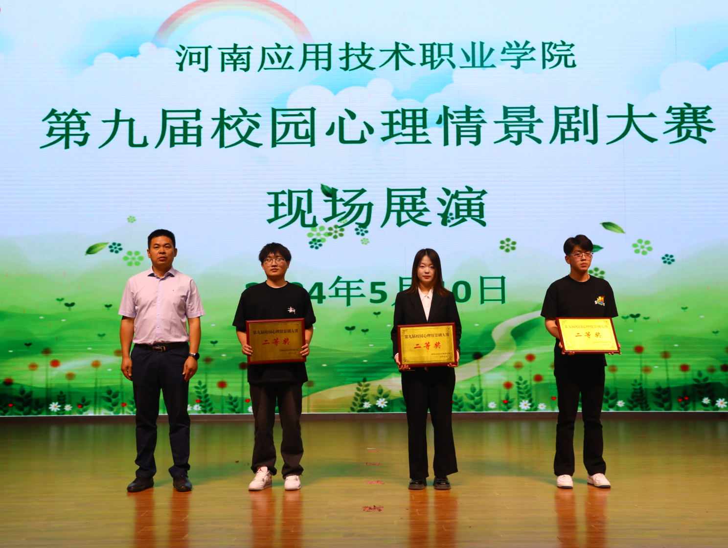 启动仪式后举行了我校第九届校园心理情景剧大赛现场展演,共有二级院部10个代表队参加,此次比赛评委由二级院部书记(副书记)担任,同时,我校退休党员教师齐观梅也亲临现场进行指导。经过前期剧本视频评价和现场展演综合评价,最终评出一等奖1名、二等奖3名、三等奖4名,信息工程学院《雨后彩虹》获得了一等奖。