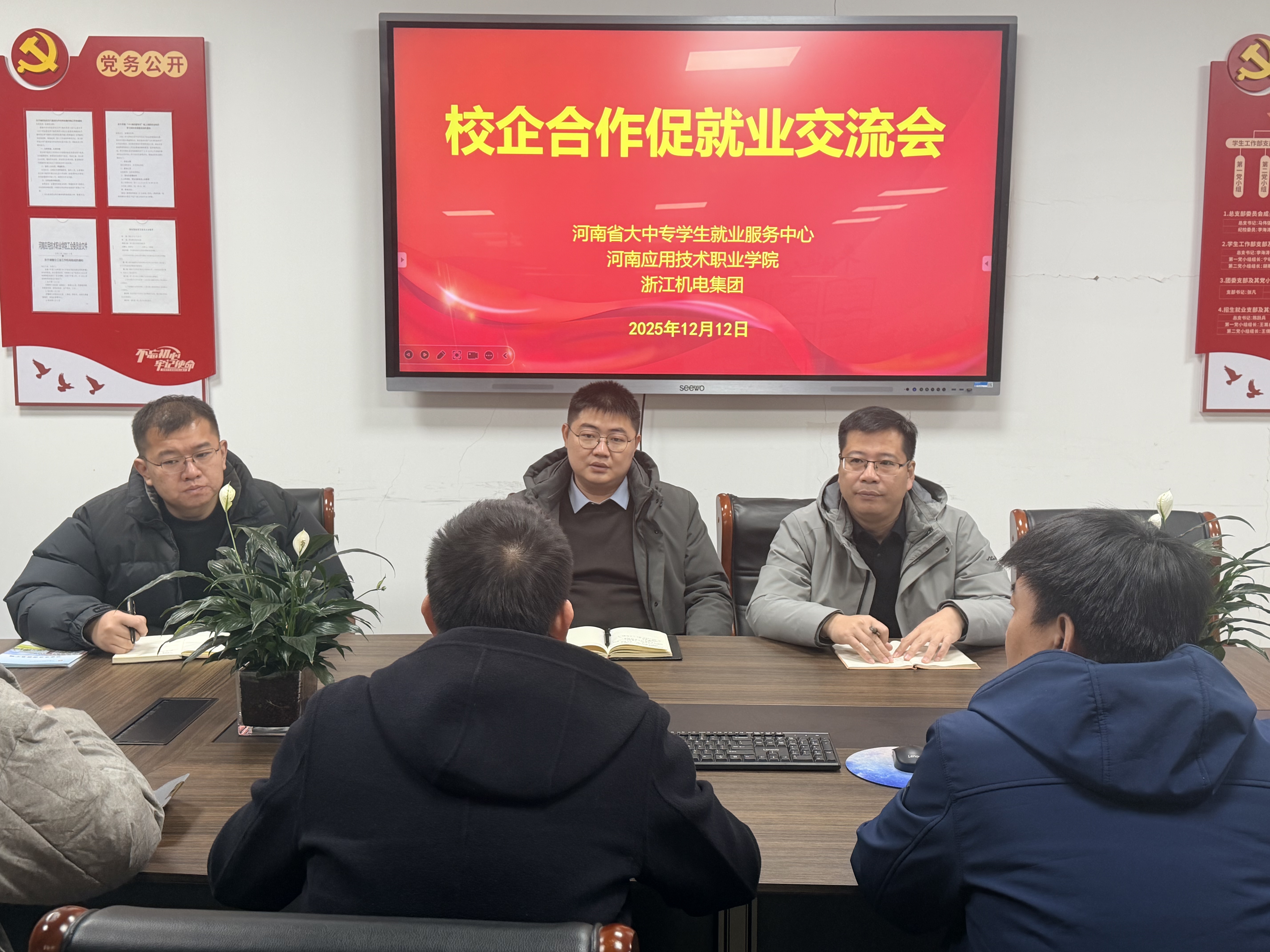 为深入贯彻落实 “稳就业、保就业” 决策部署,深化产教融合与校企协同育人,12月12日上午,在河南应用技术职业学院招生就业与校企合作处办公室成功开展校企合作促就业交流会。河南省大中专学生就业服务中心代表常兵、河南应用技术职业学院招生就业与校企合作处处长张二月、浙江机电集团工匠公司运营总监兼杭州睿匠人才服务有限公司总经理蔡呈祥出席会议,三方围绕人才培养、岗位供给、就业服务等核心议题展开深度研讨,共商合作新路径。