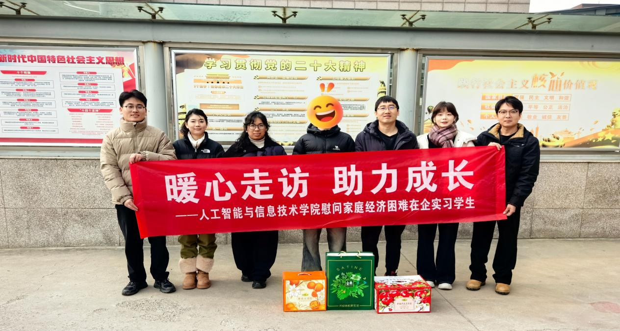 为深入贯彻高校资助育人理念,体现学院对家庭经济困难学生的持续关爱,人工智能与信息技术学院成立寒假资助政策慰问工作小组,于2026年1月27日-30日组织开展了以“暖心走访,助力成长”为主题的慰问活动,走访慰问正在企业参加岗位实习的家庭经济困难学生,为他们送上学院的关怀与新春的问候。