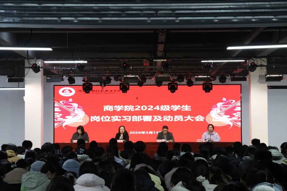 为扎实推进2024级学生岗位实习工作,帮助学生认清就业形势、合理规划实习安排,2026年3月13日,商学院在开封北院校区学生活动中心召开2024级学生岗位实习部署及动员大会。商学院党总支书记荆伟科、院长王珂、副院长刘嘉慧、团总支书记贺苗苗出席会议,辅导员及2024级全体学生参会,会议由刘嘉慧主持。