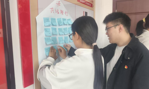 活动的最后环节是“共话践行”。每位党员在便利贴上写下一句话承诺——结合自身岗位或学业,明确在“十五五”期间要做的具体行动。大家依次上台,将便利贴贴在白板上,汇聚成一面满载责任与态度的“承诺墙”。“一句话、可执行、有态度”的承诺,既是自我鞭策,也是相互激励,体现了支部党员将规划精神落地生根的决心。