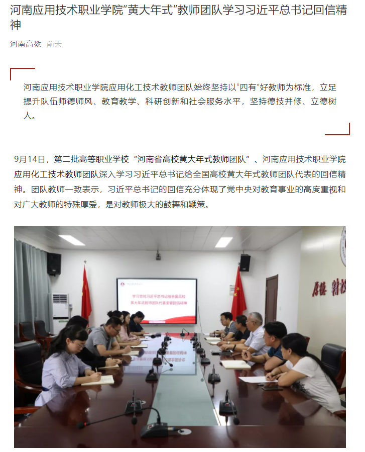 9月14日,第二批高等职业学校“河南省高校黄大年式教师团队”、河南应用技术职业学院应用化工技术教师团队深入学习习近平总书记给全国高校黄大年式教师团队代表的回信精神。团队教师一致表示,习近平总书记的回信充分体现了党中央对教育事业的高度重视和对广大教师的特殊厚爱,是对教师极大的鼓舞和鞭策