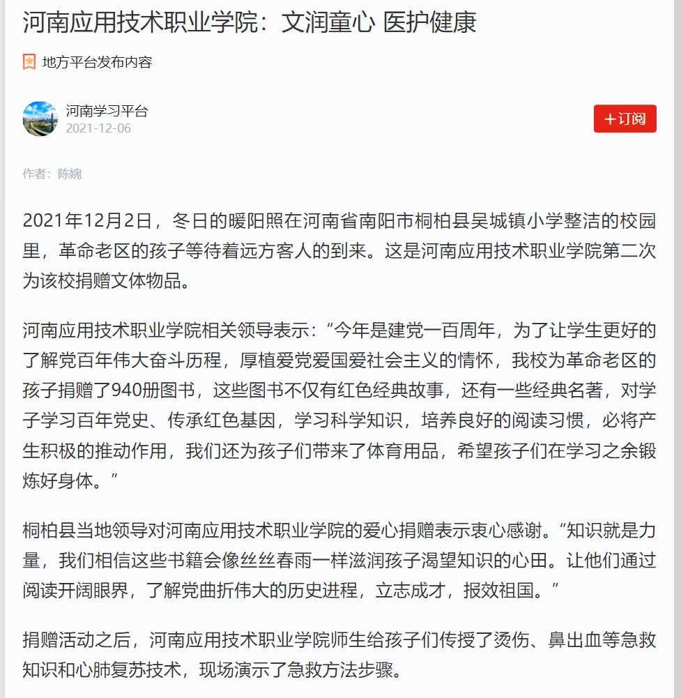 2021年12月2日,冬日的暖阳照在河南省南阳市桐柏县吴城镇小学整洁的校园里,革命老区的孩子等待着远方客人的到来。这是河南应用技术职业学院第二次为该校捐赠文体物品。