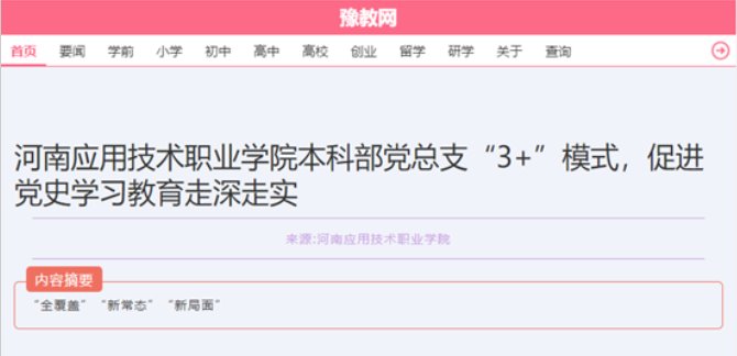豫教网对河南应用技术职业学院本科部党总支党史学习“3+”模式进行了报道。