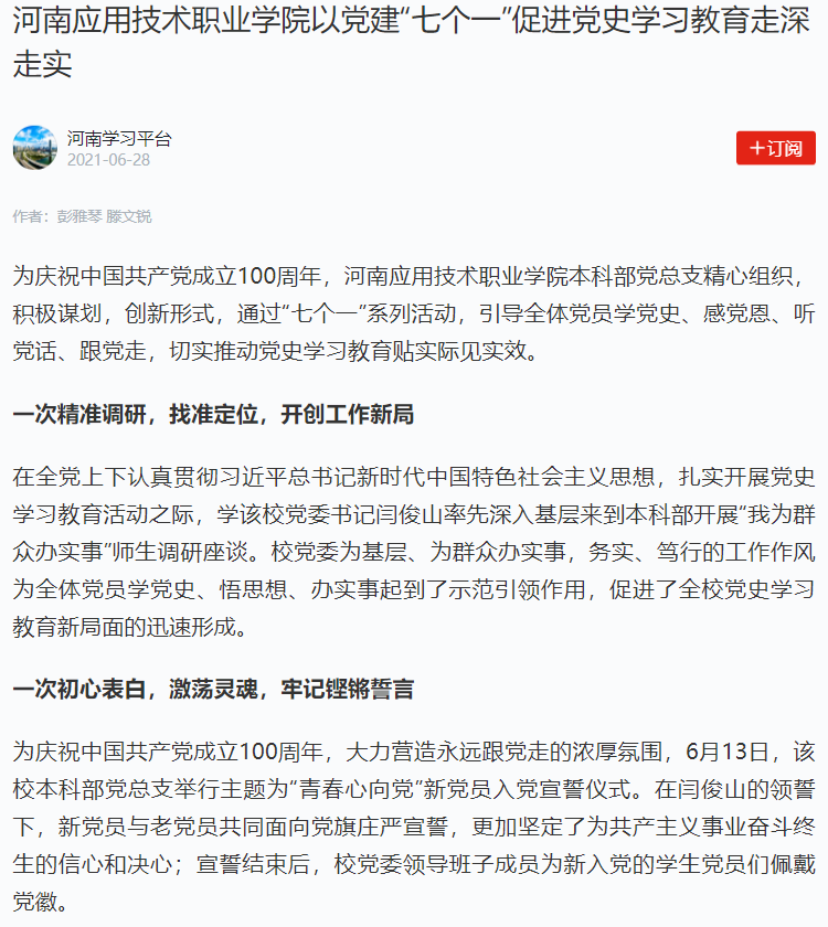 为庆祝中国共产党成立100周年,河南应用技术职业学院本科部党总支精心组织,积极谋划,创新形式,通过“七个一”系列活动,引导全体党员学党史、感党恩、听党话、跟党走,切实推动党史学习教育贴实际见实效。