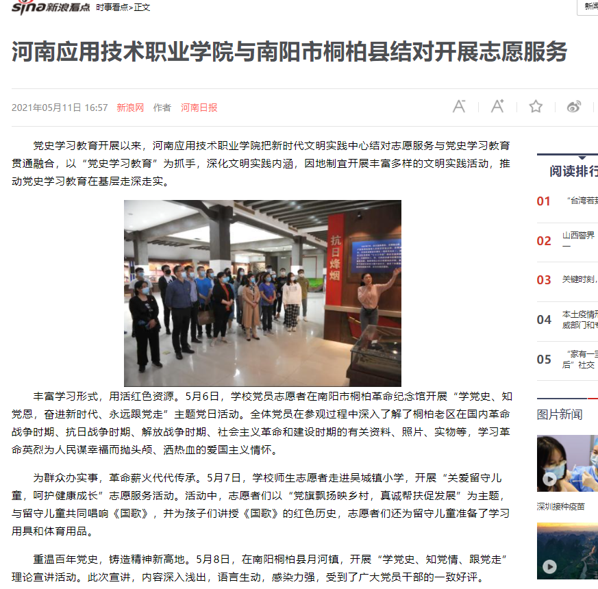党史学习教育开展以来,河南应用技术职业学院把新时代文明实践中心结对志愿服务与党史学习教育贯通融合,以“党史学习教育”为抓手,深化文明实践内涵,因地制宜开展丰富多样的文明实践活动,推动党史学习教育在基层走深走实。