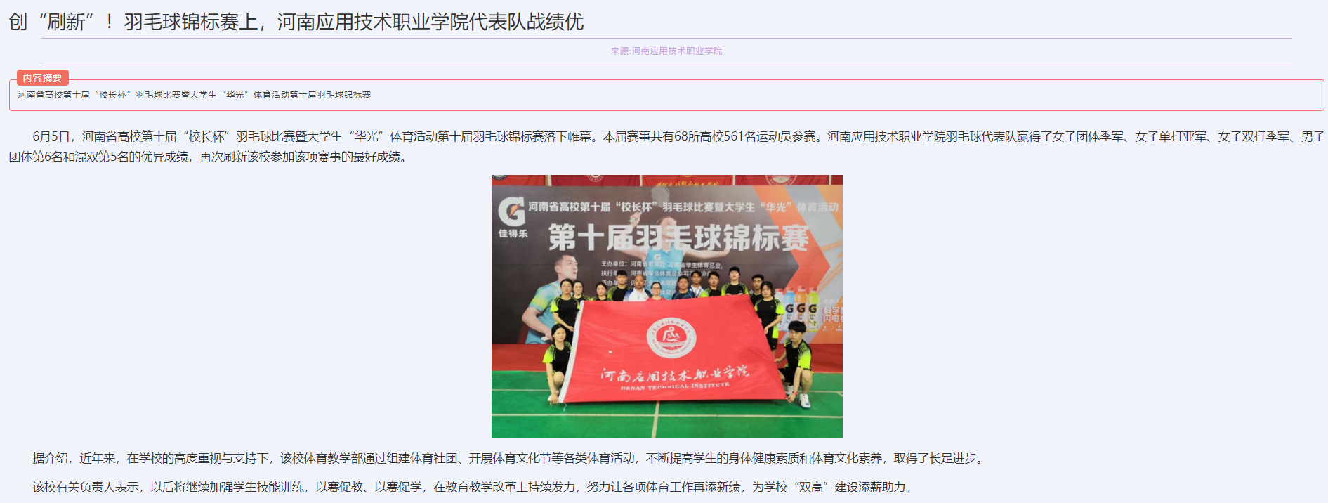 6月5日,河南省高校第十届“校长杯”羽毛球比赛暨大学生“华光”体育活动第十届羽毛球锦标赛落下帷幕。本届赛事共有68所高校561名运动员参赛。河南应用技术职业学院羽毛球代表队赢得了女子团体季军、女子单打亚军、女子双打季军、男子团体第6名和混双第5名的优异成绩,再次刷新该校参加该项赛事的最好成绩。