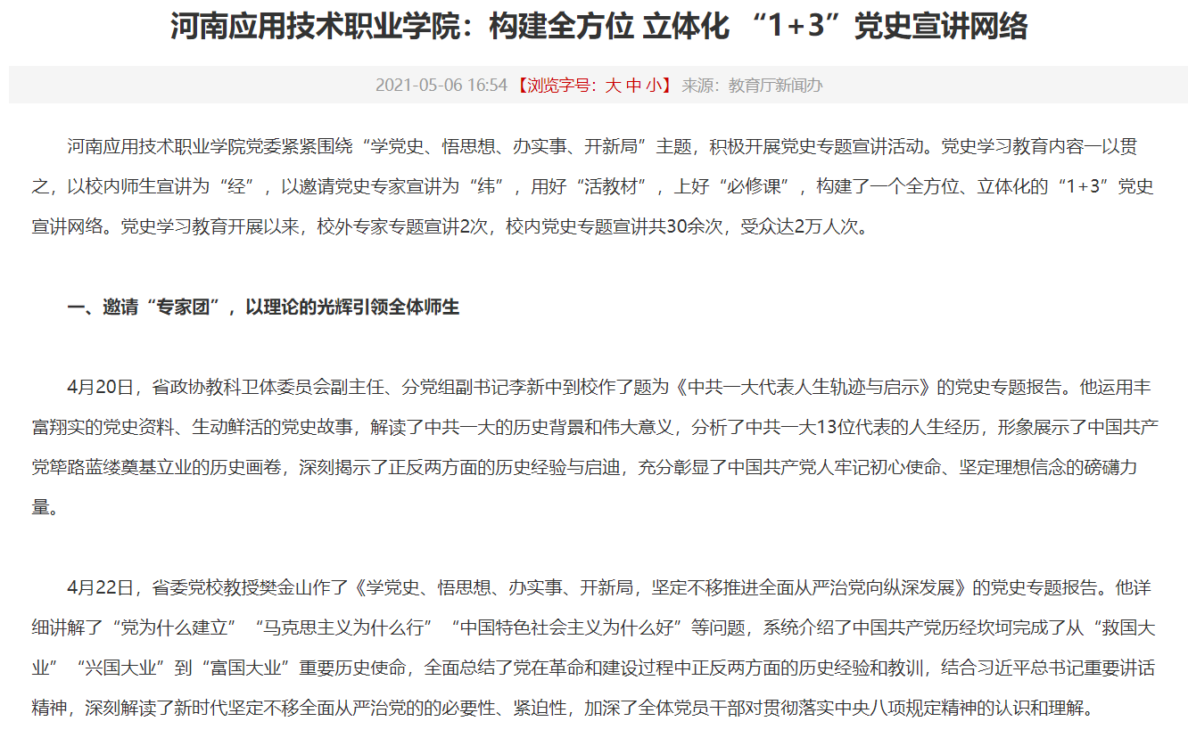 河南应用技术职业学院党委紧紧围绕“学党史、悟思想、办实事、开新局”主题,积极开展党史专题宣讲活动。党史学习教育内容一以贯之,以校内师生宣讲为“经”,以邀请党史专家宣讲为“纬”,用好“活教材”,上好“必修课”,构建了一个全方位、立体化的“1+3”党史宣讲网络。党史学习教育开展以来,校外专家专题宣讲2次,校内党史专题宣讲共30余次,受众达2万人次。