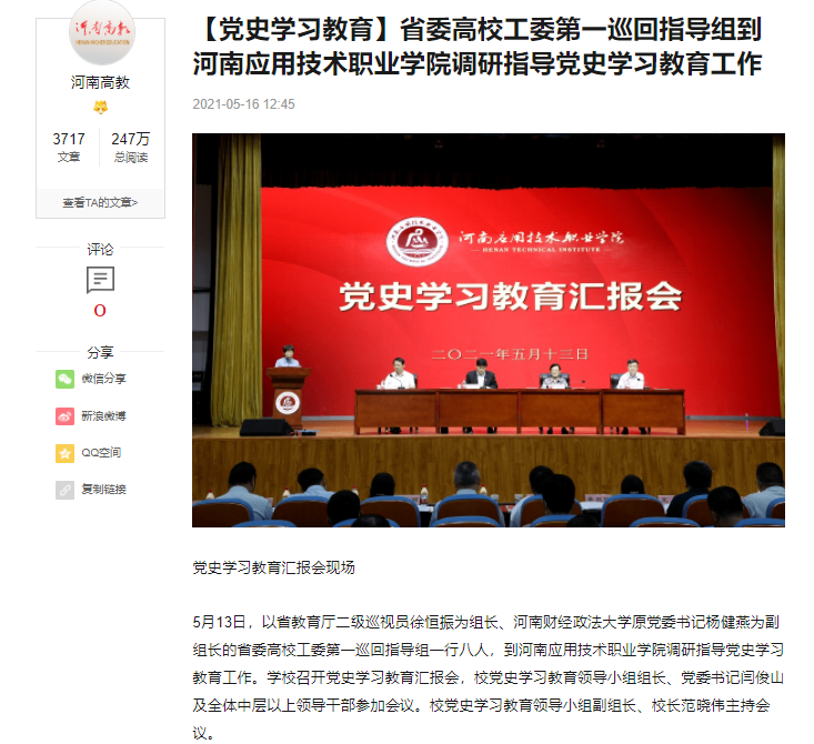 5月13日,以省教育厅二级巡视员徐恒振为组长、河南财经政法大学原党委书记杨健燕为副组长的省委高校工委第一巡回指导组一行八人,到河南应用技术职业学院调研指导党史学习教育工作。学校召开党史学习教育汇报会,校党史学习教育领导小组组长、党委书记闫俊山及全体中层以上领导干部参加会议。校党史学习教育领导小组副组长、校长范晓伟主持会议。