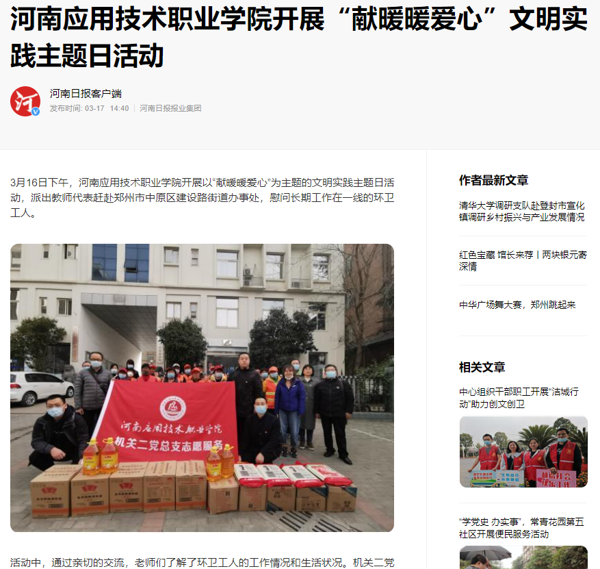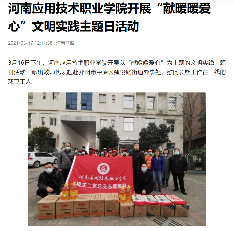 3月16日下午,河南应用技术职业学院开展以“献暖暖爱心”为主题的文明实践主题日活动,派出教师代表赶赴郑州市中原区建设路街道办事处,慰问长期工作在一线的环卫工人。