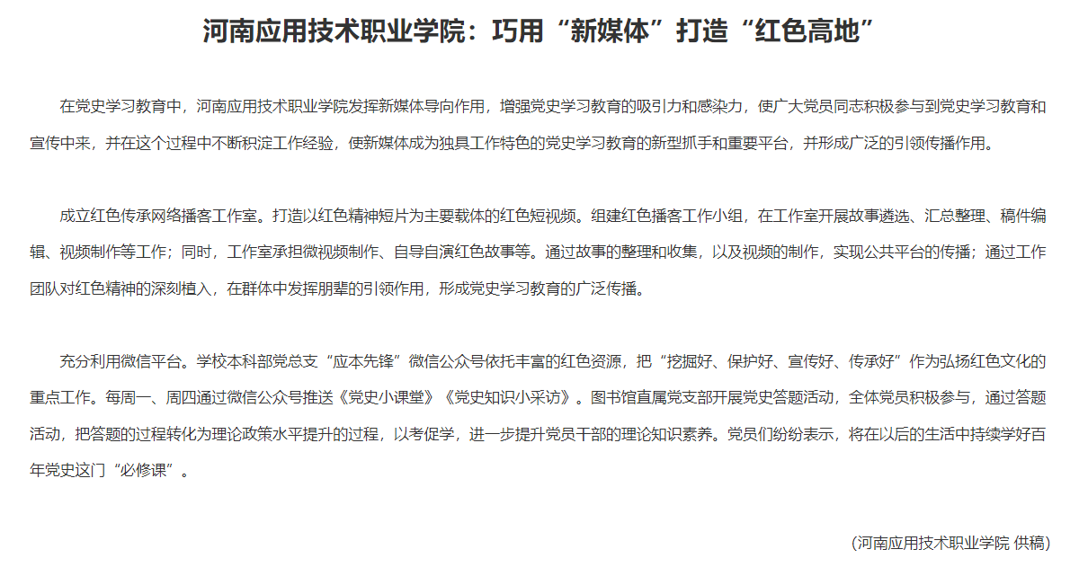 在党史学习教育中,河南应用技术职业学院发挥新媒体导向作用,增强党史学习教育的吸引力和感染力,使广大党员同志积极参与到党史学习教育和宣传中来,并在这个过程中不断积淀工作经验,使新媒体成为独具工作特色的党史学习教育的新型抓手和重要平台,并形成广泛的引领传播作用。