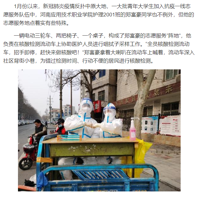 1月份以来,新冠肺炎疫情反扑中原大地,一大批青年大学生加入抗疫一线志愿服务队伍中,河南应用技术职业学院护理2001班的郑富豪同学也不例外,但他的志愿服务地点着实有些特殊。