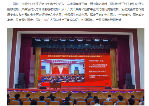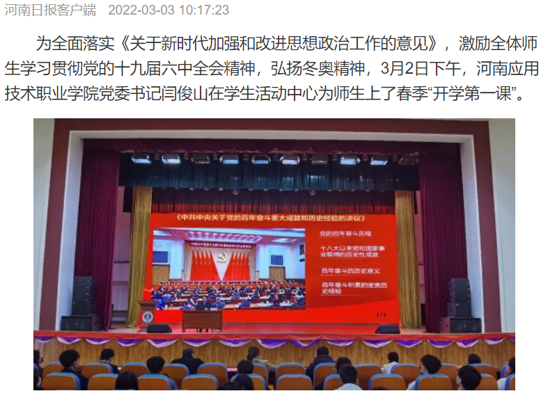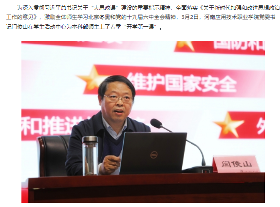 为深入贯彻习近平总书记关于“大思政课”建设的重要指示精神,全面落实《关于新时代加强和改进思想政治工作的意见》,激励全体师生学习北京冬奥和党的十九届六中全会精神,3月2日,河南应用技术职业学院党委书记闫俊山在学生活动中心为本科部师生上了春季“开学第一课”。