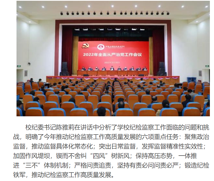 大河网讯 3月10日,河南应用技术职业学院召开2022年全面从严治党工作会议。学校党委委员,纪委委员,中层干部和各党总支、直属党支部纪检委员参加会议。校长范晓伟主持会议。