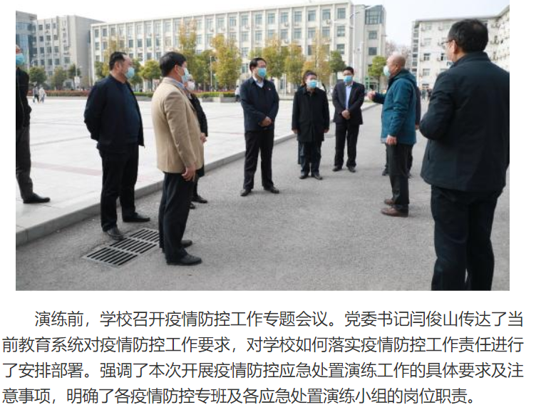 为进一步提升学校疫情防控应急处置能力,保障全校师生员工身体健康和生命安全,3月22日、3月24日下午,河南应用技术职业学院分别在郑州校区和开封校区开展了疫情防控应急处置演练。该校领导班子成员,疫情防控领导小组各工作专班主要负责同志及师生代表参加演练。