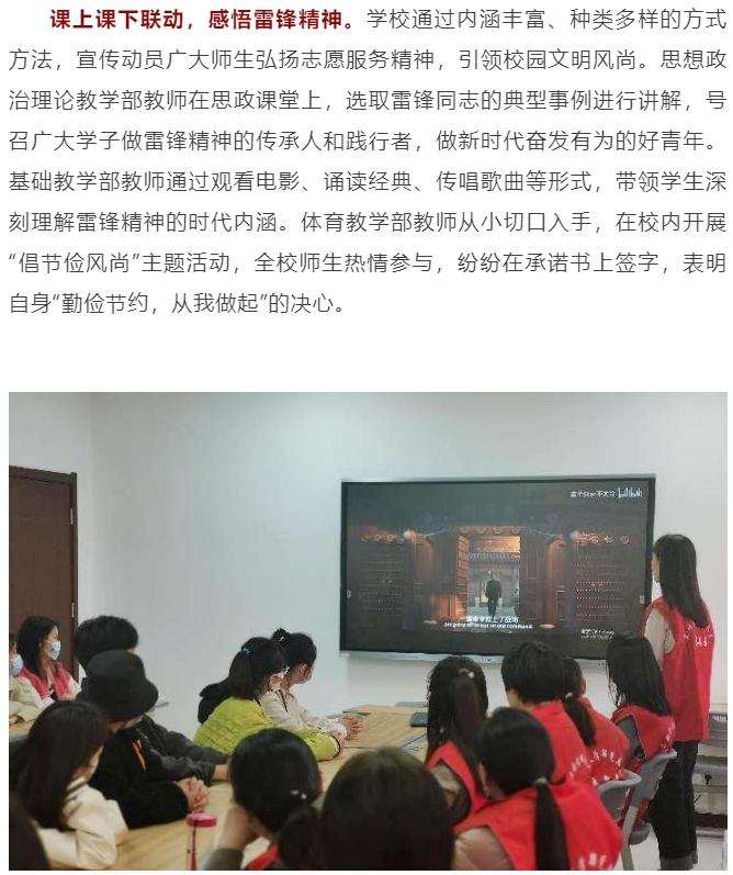 雷锋精神暖人心,河南应用技术职业学院传承和弘扬奉献、友爱、互助、进步的志愿精神,组织开展主题“豫见新一代”学雷锋志愿服务月活动,推动全体师生在志愿行动中贡献智慧力量,在为民服务中展现担当作为,进一步提升学校精神文明建设水平。