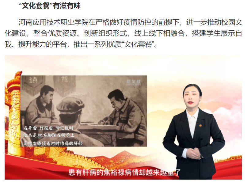 当前,疫情形势依旧严峻复杂,河南应用技术职业学院严格落实上级有关会议精神和属地防控部门要求,对学校进行相对封闭管理。但封闭却封不住青春的风采!为缓解学生的压力,学校为广大师生准备了丰盛的“特色套餐”,让学子足不出校,尽享精彩课余生活。