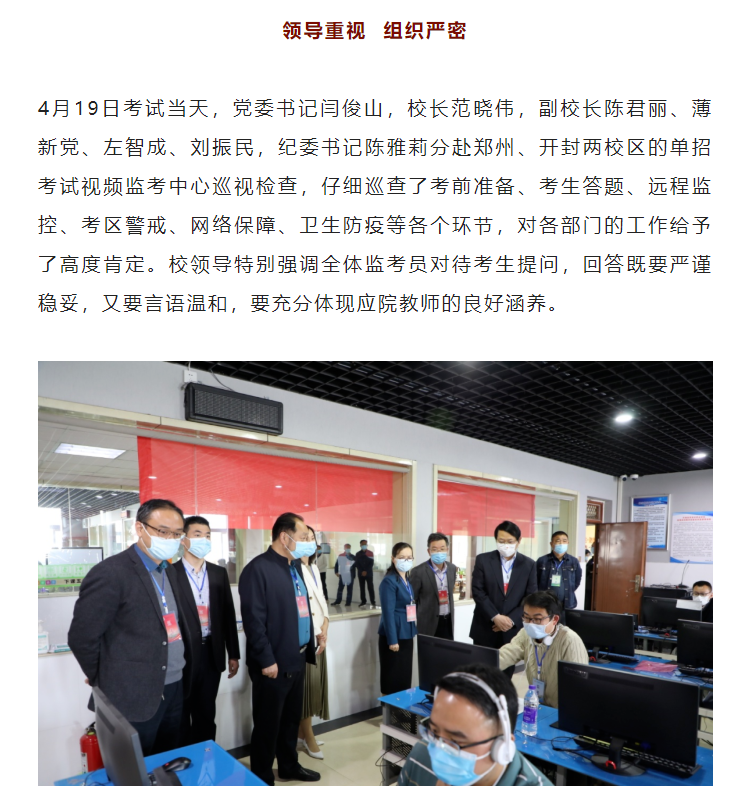 4月19日,河南应用技术职业学院2022年单招考试视频监考中心,一派紧张繁忙却秩序井然的场景,二百余名工作人员以专业的素养和热情的态度,为四千余名“小萌新”提供了优质的单招线上考试服务。单招考试严谨肃穆,单招故事感人暖心。