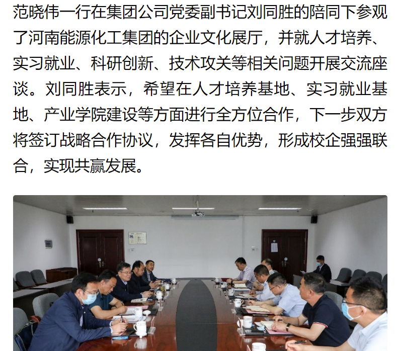 为深入贯彻落实教育部办公厅《关于开展全国高校书记校长访企拓岗促就业专项行动的通知》文件精神,助力学生高质量就业,4月27日上午,河南应用技术职业学院校长范晓伟、副校长薄新党一行赴河南能源化工集团走访调研,促进产教融合,深化校企合作,大力开拓毕业生就业市场。