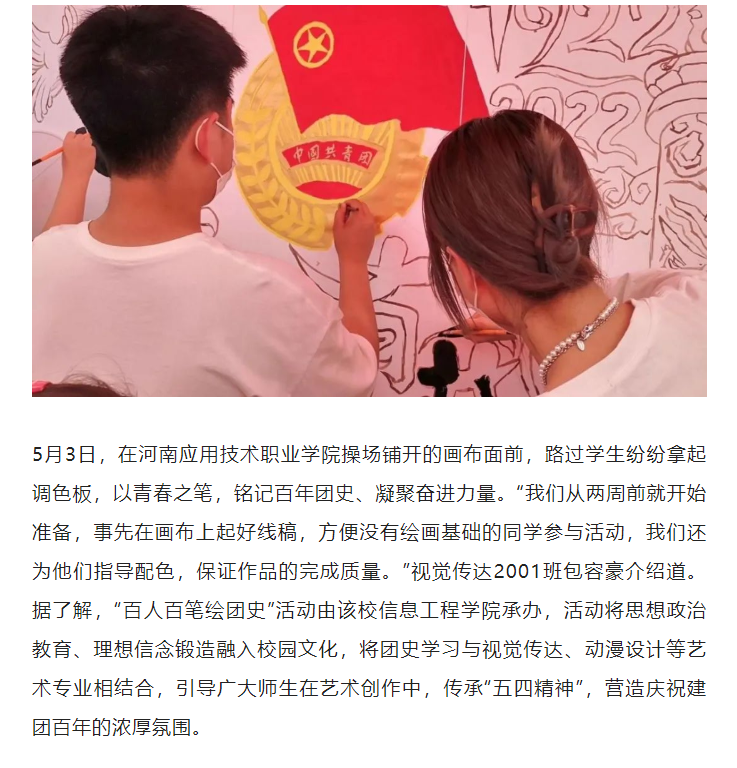 五月立夏,繁花似锦;建团百年,风华正茂。在喜迎中国共产主义青年团成立100周年之际,河南应用技术职业学院组织开展“三个一百”系列活动,“百人百笔绘团史”“百米接力忆征程”百名青年寄语建团百年”,以多种形式从熠熠生辉的建党建团史中汲取奋进力量,展现新时代青年学子的蓬勃朝气,向百年岁月致敬,向美好未来进发!