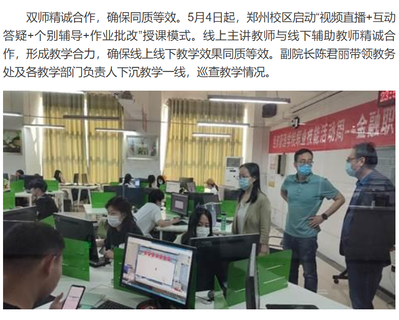 精准研判形势,科学调整部署。5月3日,河南应用技术职业学院党政领导班子召开疫情防控工作紧急会议,分析研判当前郑州疫情防控形势,按照“静态管理”的原则调整教学运行,紧急出台了《关于郑州校区启动线上线下混合式教学工作的紧急通知》,积极动员各教学部门领导干部、辅导员、教研室主任、专业负责人、党员教师驻校工作,负责校内线下教学以及作为线上教学的辅助教师。各教学部门制定线上线下混合式教学具体运行方案。