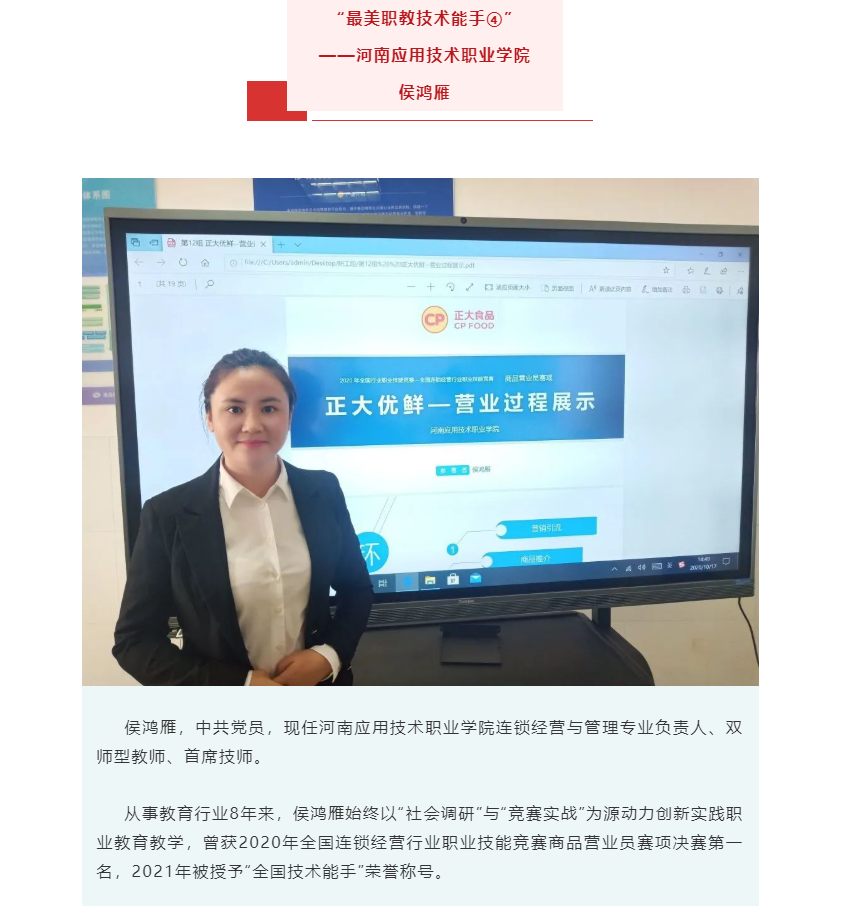 根据《河南省教育厅关于开展“最美职教技术能手”“最美未来工匠”等系列宣传活动暨“技能成才·强国有我”主题教育活动的通知》,今天,我们聚焦“最美职教技术能手”——河南应用技术职业学院侯鸿雁。