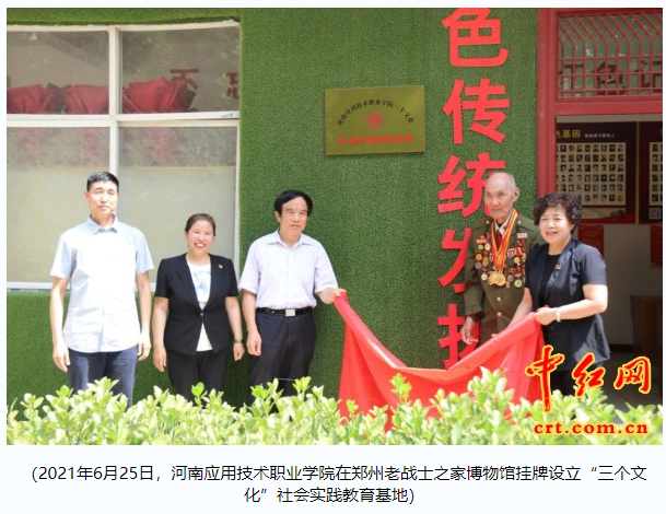 人无德不立,育人的根本在于立德。为落实立德树人根本任务,进一步弘扬中华优秀传统文化、社会主义先进文化和红色革命文化,促进大学生德育实践取得更深入的效果,2021年河南应用技术职业学院和郑州老战士之家抗美援朝战争口述历史博物馆共同建设的“河南应用技术职业学院三个文化社会实践教育基地”于6月25日正式成立,如今整整一年时间了,在这一年中双方加强老战士和学校师生在实践基地的交流,构建“三个文化育人”体系,取得了一系列教育成果,交出了属于自己的答卷。