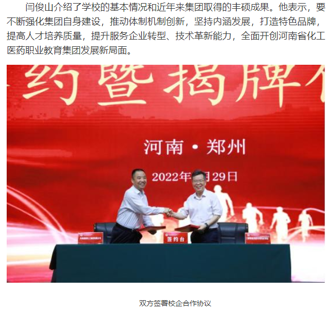 6月29日,河南省化工医药职业教育集团2022工作会议在河南应用技术职业学院召开。河南应用技术职业学院党委书记闫俊山,院长范晓伟,副院长陈君丽、刘振民,河南能源化工集团有限公司党委副书记刘同胜,河南华夏健康集团总经理朱庆凯出席会议。来自省内外成员单位的160余名代表通过线下和“云端”参会。会议由河南省化工医药职教集团秘书长、河南应用技术职业学院副院长薄新党主持。