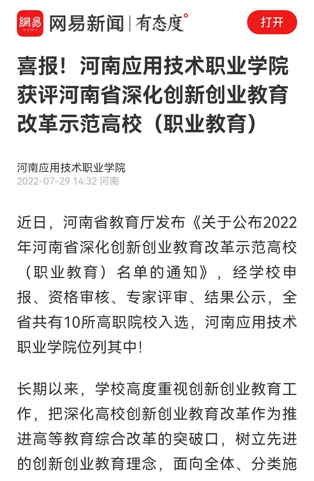 近日,河南省教育厅发布《关于公布2022年河南省深化创新创业教育改革示范高校(职业教育)名单的通知》,经学校申报、资格审核、专家评审、结果公示,全省共有10所高职院校入选,河南应用技术职业学院位列其中!
