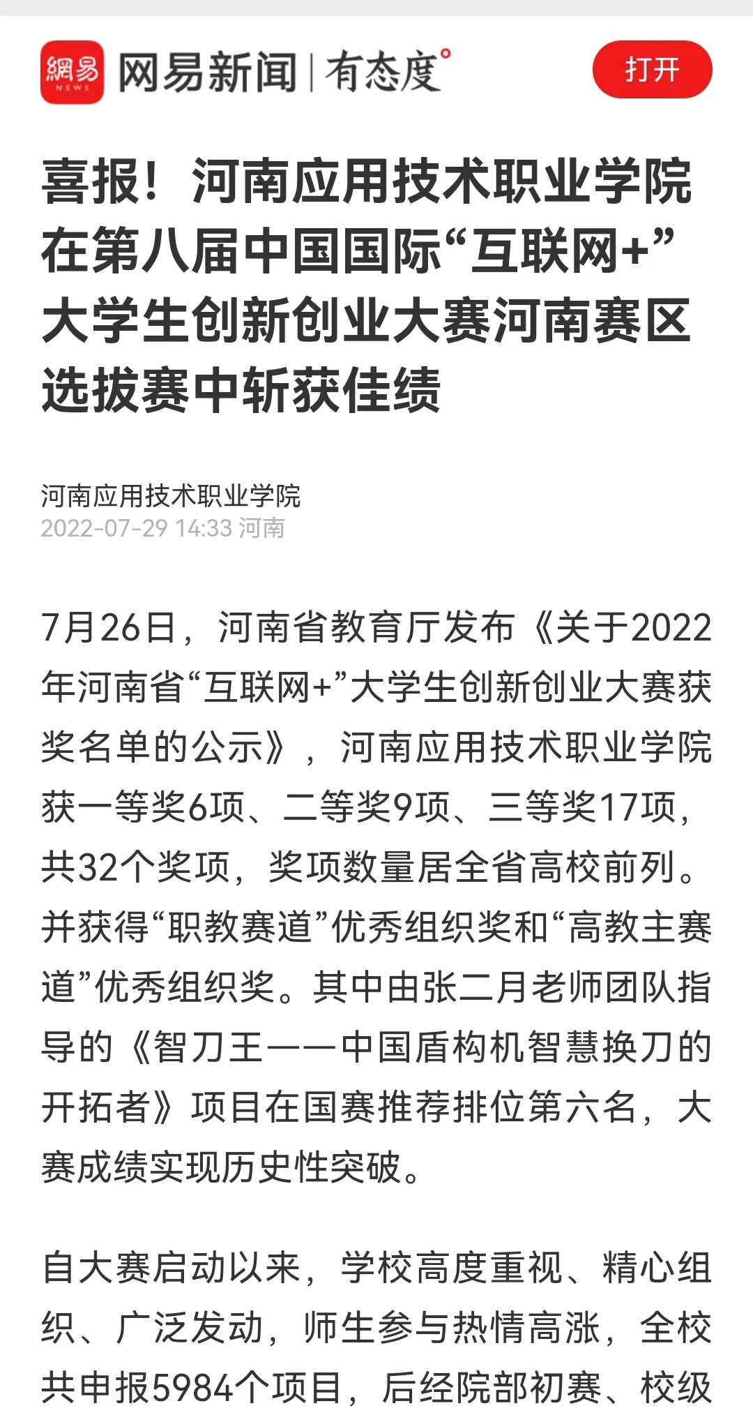 7月26日,河南省教育厅发布《关于2022年河南省“互联网+”大学生创新创业大赛获奖名单的公示》,河南应用技术职业学院获一等奖6项、二等奖9项、三等奖17项,共32个奖项,奖项数量居全省高校前列。并获得“职教赛道”优秀组织奖和“高教主赛道”优秀组织奖。其中由张二月老师团队指导的《智刀王——中国盾构机智慧换刀的开拓者》项目在国赛推荐排位第六名,大赛成绩实现历史性突破。